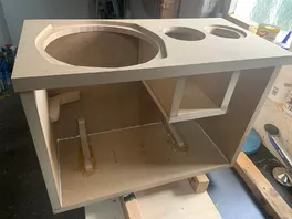 Z.B. diese furchtbaren Körbe der Sphis Chassis. Anstatt es irgendwie hinzuwurschteln, habe ich so lange rumgemacht (Oberfräse mit Kopierhülse, Schablone erstellen etc.), bis es einigermaßen gut aussah. Eigentlich werden die ja von hinten montiert, aber dann müsste ich den Aufwand betreiben, die Rückwand öffnen zu können. Außerdem dachte ich, es ist besser von vorne, weil dadurch der SEO etwas nach vorne kommt. Es sind nur 1,5 cm, aber vielleicht braucht man das auch nicht.