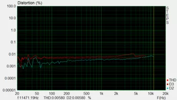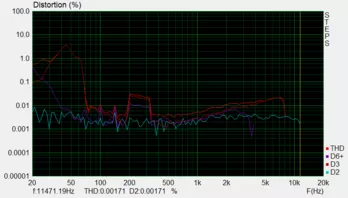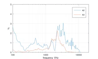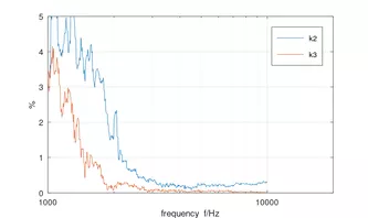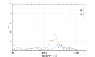 Oberhalb von 2 kHz sind beide Klirr-Komponenten unterhalb von 1%. Oberhalb von 3 kHz sogar unter 0,5%.