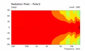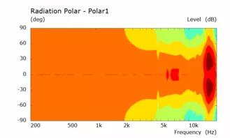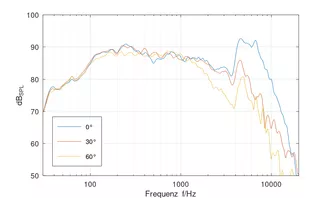 Es zeigt sich ein relativ gleichmäßiger Frequenzgang, der aber noch einen breitbandigen Einbruch über 10 kHz enthält und eine relativ gleichmäßige horizontale und vertikale Abstrahlung wobei die horizontale deutlich breiter ist als die vertikale.